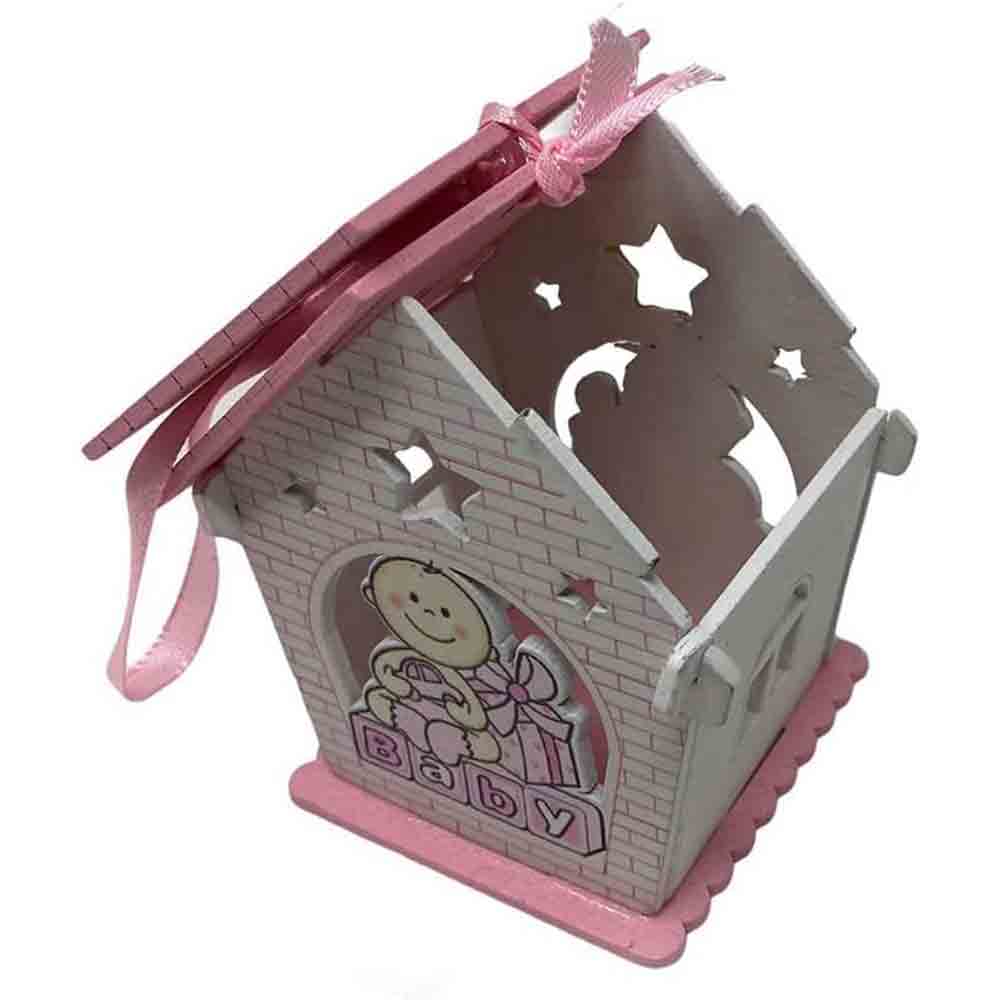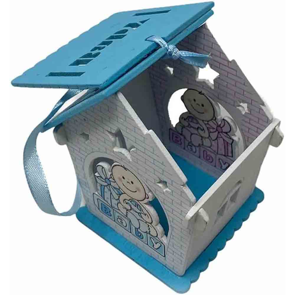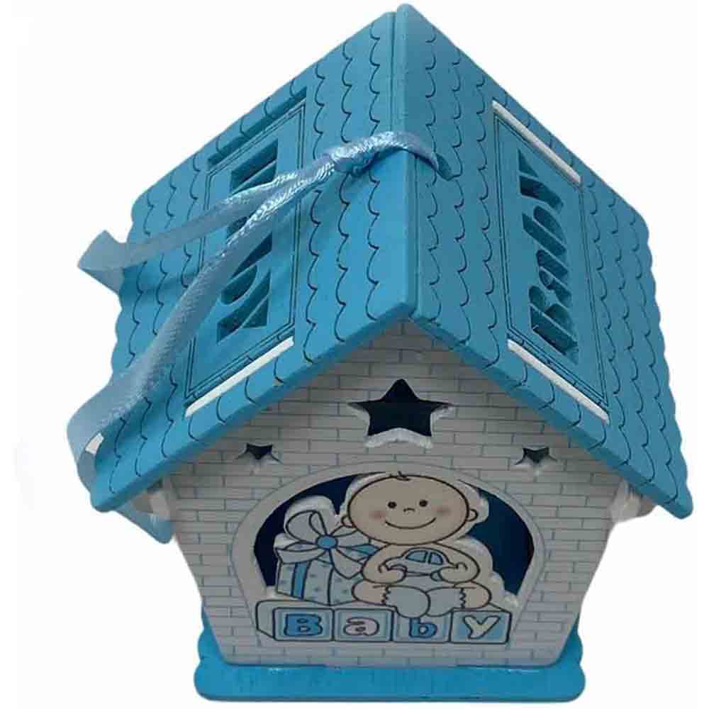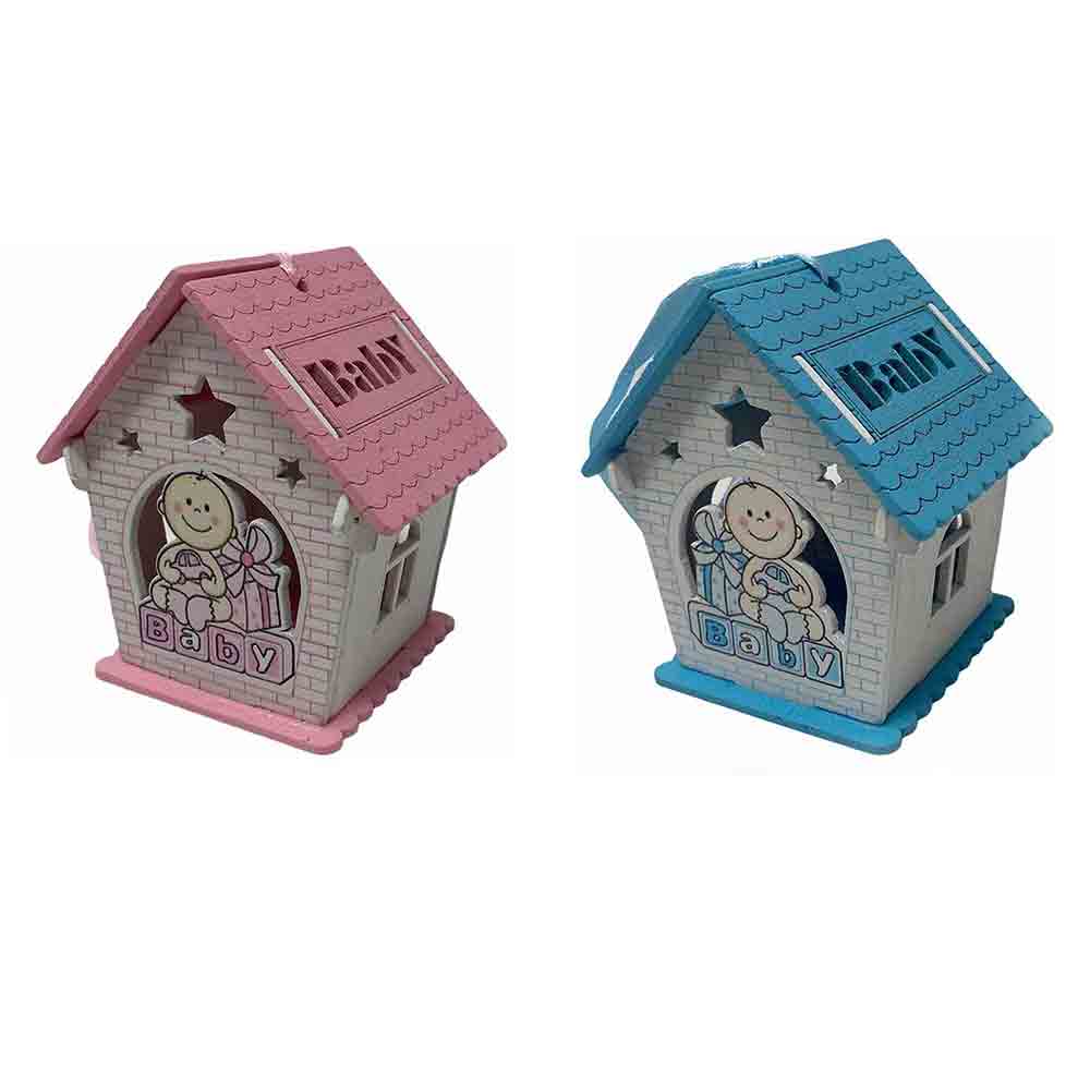 Un set incantevole di 12 delicate casette in legno, perfette per celebrare l'arrivo di un nuovo membro della famiglia. Ciascuna casetta è  disponibile in due soffici tonalità: rosa per le principessine e celeste per i piccoli principi. La parte anteriore e posteriore di ogni casetta è decorata con un tenero neonato circondato da doni, un'immagine che evoca gioia e felicità.   Il tetto della casetta si apre, rivelando uno spazio interno perfetto per contenere confetti colorati o piccole caramelle. Un tocco dolce e goloso per i tuoi ospiti.  Lateralmente, le finestre aggiungono un tocco di luminosità e delicatezza. Inoltre, il nastrino sul tetto permette di appendere le casette, trasformandole in originali decorazioni per la cameretta del bambino o per la tavola del buffet.
