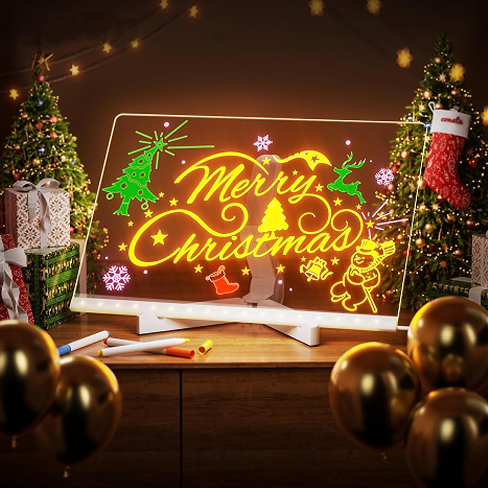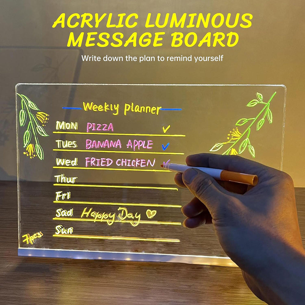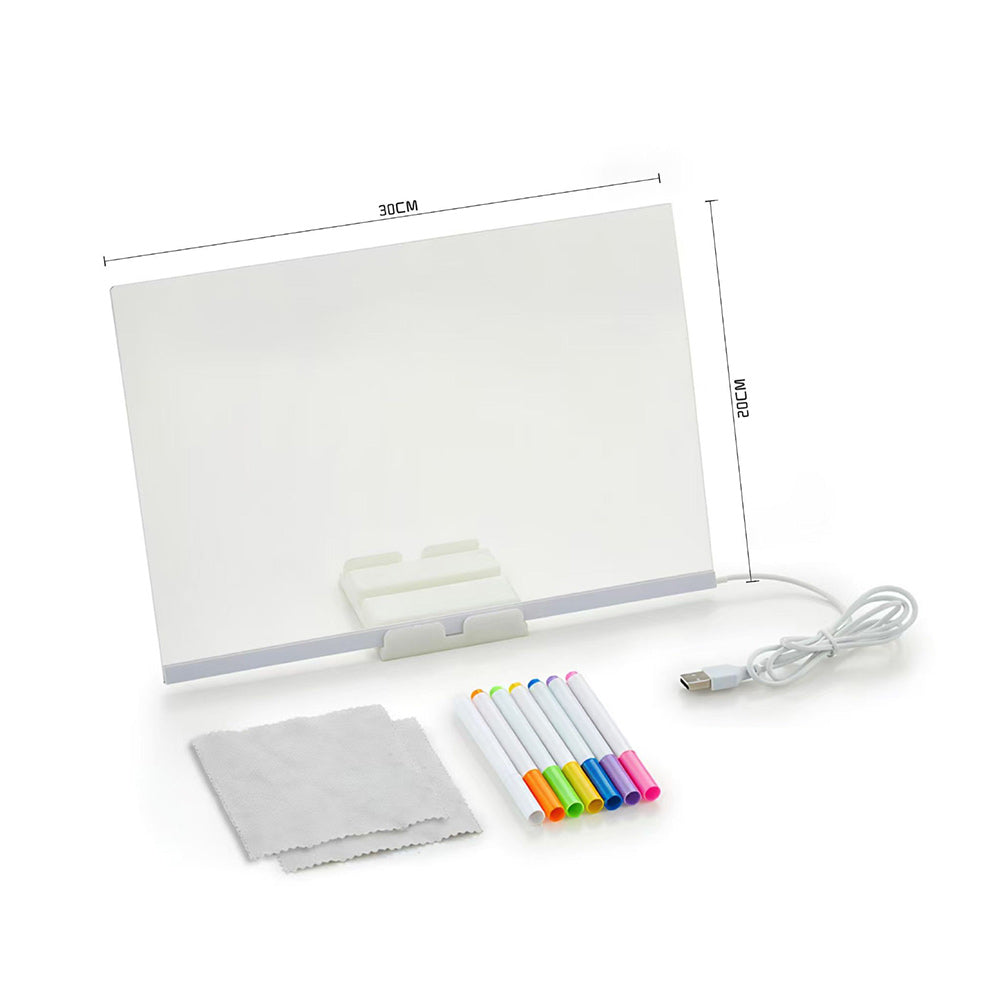 La lavagna acrilica LED è un accessorio creativo e multifunzionale che unisce praticità e design. Oltre a essere una lavagna su cui scrivere, disegnare e organizzare le proprie idee, funge anche da lampada LED, rendendola perfetta come luce notturna o lampada da comodino. Inclusi nella confezione ci sono 7 pennarelli colorati che permettono di trasformarla in un vero e proprio blocco note: puoi scrivere messaggi, creare piani di lavoro, disegnare, organizzare lo studio o stilare liste di cose da fare. È ideale anche per bar, ristoranti e locali, dove può diventare un’insegna luminosa per menù o comunicazioni speciali. La luce LED integrata valorizza ogni scritta, rendendola visibile anche al buio, e grazie al cavo USB incluso, l’alimentazione è semplice e comoda. La lavagna si pulisce facilmente con la pezzolina in dotazione o con carta assorbente, ed è dotata di una pratica staffa pieghevole per posizionarla ovunque tu voglia. Prima dell’uso, ricordati di rimuovere la pellicola protettiva da entrambi i lati per ottenere la massima trasparenza e brillantezza. Un oggetto unico che illumina le tue idee e dà spazio alla tua creatività.