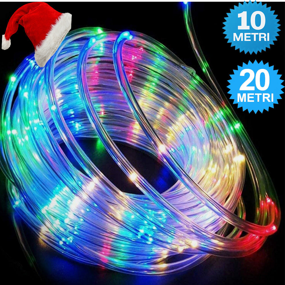 Il tubo luminoso a LED multicolor è la soluzione ideale per creare un’atmosfera natalizia magica e accogliente sia all’interno che all’esterno. Dotato di 8 giochi di luce diversi, permette di scegliere ogni volta l’effetto più adatto, da quelli più delicati e romantici fino a quelli dinamici e scintillanti. È disponibile in due lunghezze, da 10 metri e da 20 metri, così da adattarsi facilmente a spazi piccoli o a decorazioni più ampie e scenografiche. Grazie alla sua flessibilità e resistenza può essere installato in moltissimi modi: all’esterno su balconi, terrazze, cancelli, ringhiere, giardini e facciate, oppure all’interno lungo scale, porte e finestre, su mensole, camini o per incorniciare l’albero di Natale. È perfetto anche per gazebo, pergolati, vetrine e allestimenti speciali, trasformando ogni ambiente in un palcoscenico di luce e colore pronto a regalare emozioni durante tutte le feste.