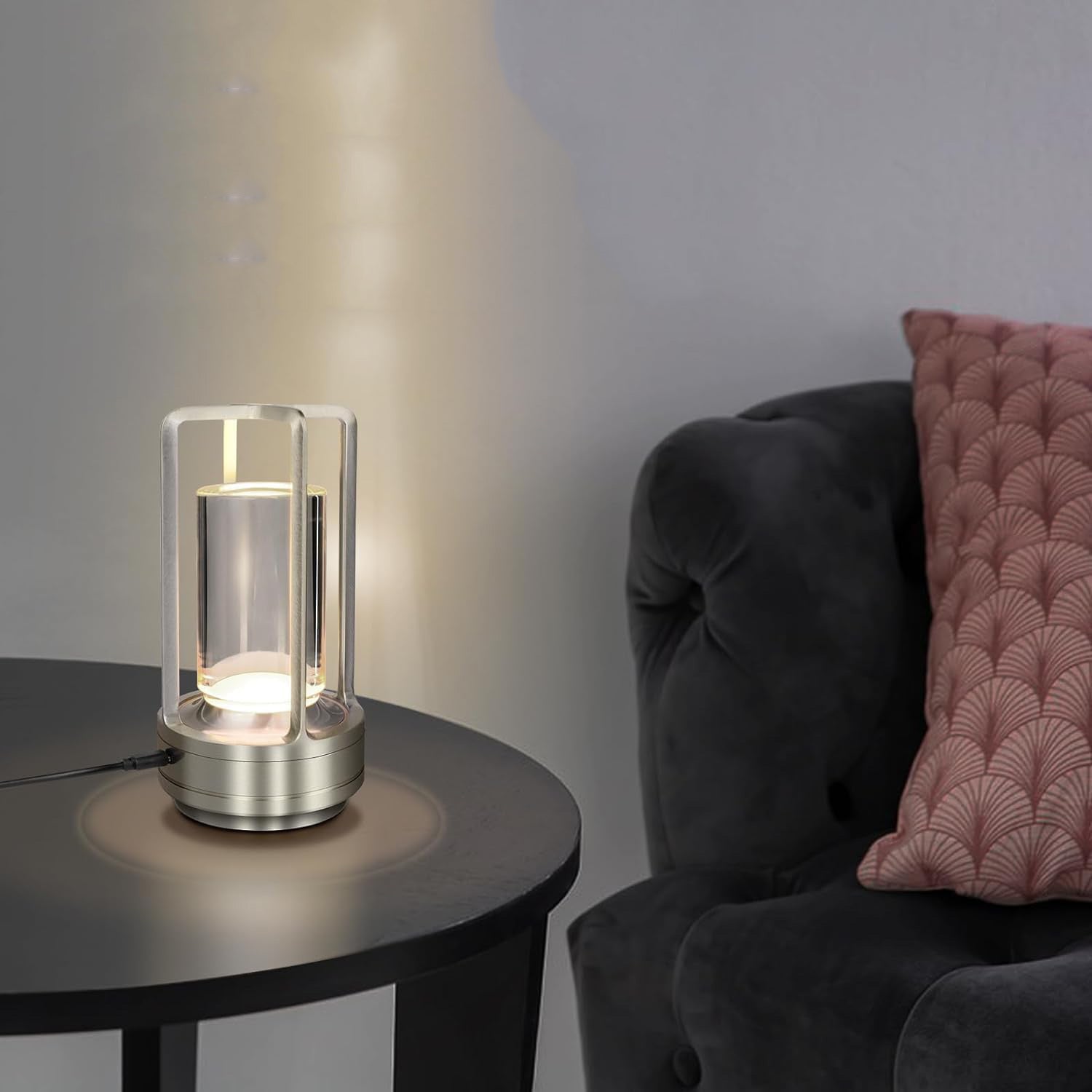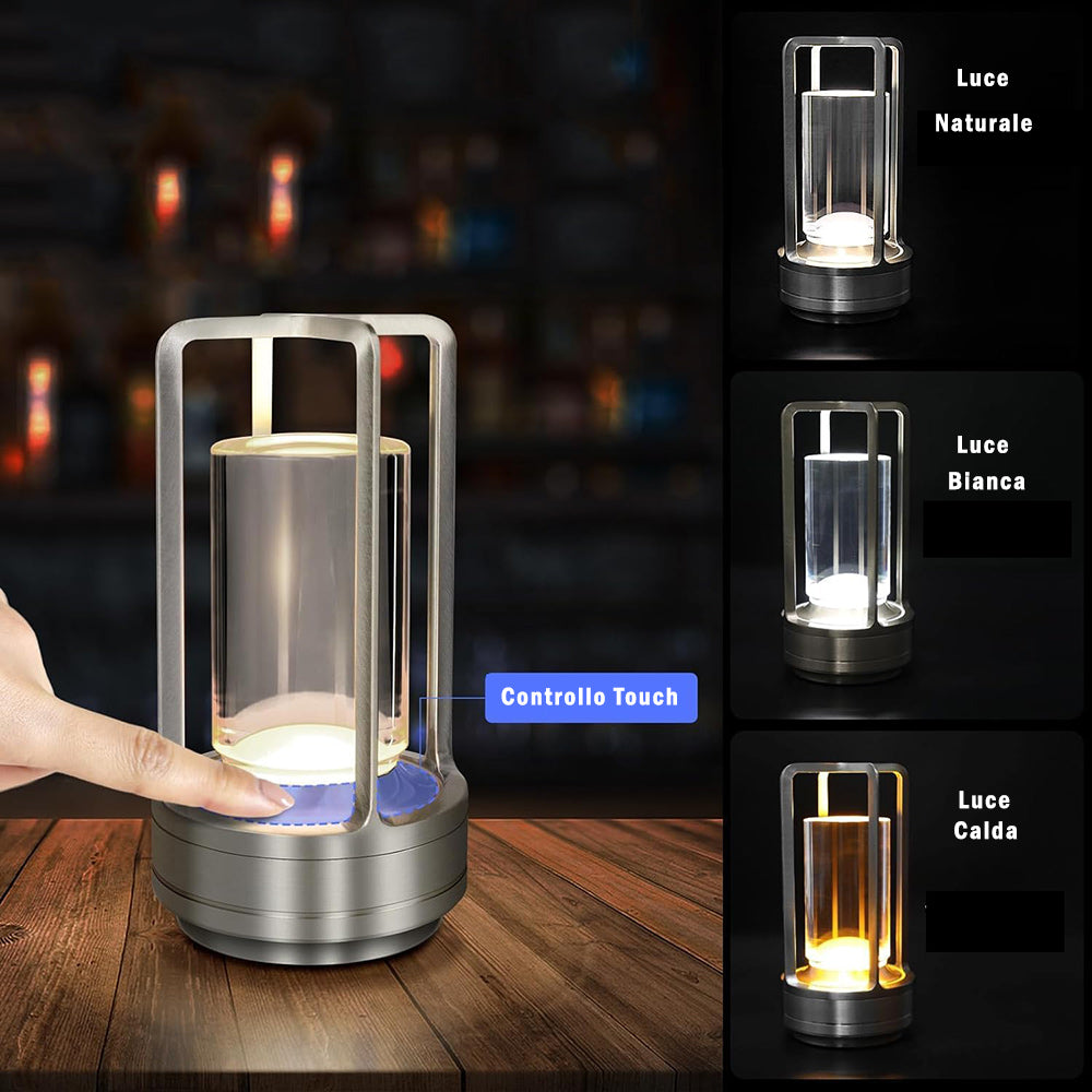 Lampada da tavolo dal design originale ispirato alla forma di una lanterna, realizzata con una combinazione raffinata di alluminio e acrilico che dona leggerezza, resistenza e un tocco contemporaneo. Pensata per chi ama l’equilibrio tra estetica e funzionalità, questa lampada è molto più di un semplice punto luce: è un elemento d’arredo capace di trasformare l’atmosfera di ogni ambiente. Il sistema di illuminazione integrato offre tre tonalità di luce – fredda, naturale e calda – facilmente selezionabili con un semplice tocco sull’anello interno della base. Basta sfiorarlo per cambiare colore, oppure tenerlo premuto per regolare l’intensità luminosa secondo le proprie esigenze, creando ambienti rilassanti, stimolanti o romantici con un gesto intuitivo. Grazie alla sua versatilità, si adatta perfettamente a molteplici contesti: è ideale sul comodino in camera da letto, sulla scrivania in ufficio, come luce d’atmosfera in ristoranti, caffè e bar, oppure come dettaglio elegante in hotel, terrazze, patii esterni o angoli dedicati al relax. La lampada ha una potenza di 3 watt e un flusso luminoso di 130 lumen, equivalente a una lampadina tradizionale da 13 watt, garantendo efficienza energetica e prestazioni ottimali. È ricaricabile tramite cavo USB incluso, con un tempo di ricarica di circa 2 ore e un’autonomia che arriva fino a 5 ore, perfetta per accompagnarti durante le serate o per creare un’illuminazione discreta e continua. Disponibile in due finiture eleganti, Oro e Silver, si integra armoniosamente in qualsiasi stile d’arredo, aggiungendo un tocco di classe e personalità.
