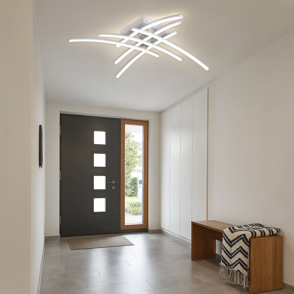 Questo lampadario moderno si distingue per il suo design scultoreo e contemporaneo, composto da 6 barre LED curve che si incrociano elegantemente a partire da una base rettangolare centrale. La struttura è realizzata in materiali di alta qualità con finitura bianca, pensata per integrarsi armoniosamente in ambienti minimalisti e raffinati. La potenza di 36 watt garantisce un’illuminazione efficace, mentre il flusso luminoso di 3040 lumen assicura una luce intensa e uniforme, distribuita con un ampio angolo di 180°, ideale per illuminare spazi generosi senza creare zone d’ombra. Grazie alla tecnologia CCT integrata, è possibile selezionare la tonalità di luce più adatta alle proprie esigenze: luce calda a 3000K per un’atmosfera accogliente, luce naturale a 4000K per un’illuminazione equilibrata, oppure luce fredda a 6500K per ambienti più dinamici e funzionali. La regolazione avviene tramite uno switch sul driver, permettendo di modificare la temperatura colore in qualsiasi momento e creare l’ambiente perfetto in base all’uso dello spazio o all’umore desiderato. Questo lampadario è perfetto per ingressi ampi, soggiorni moderni, open space, corridoi luminosi o zone studio dal gusto contemporaneo. La sua forma artistica non solo illumina ma arreda, diventando un vero e proprio elemento decorativo che valorizza l’architettura dell’ambiente. Si installa a soffitto con facilità e si adatta sia a contesti residenziali che professionali, offrendo una soluzione luminosa versatile e di grande impatto visivo.