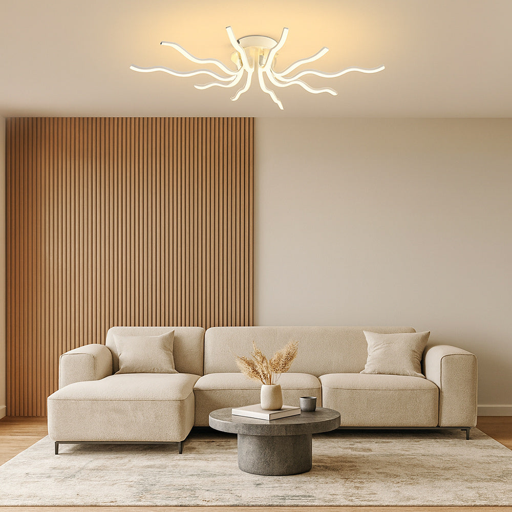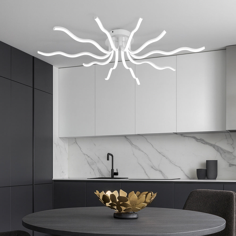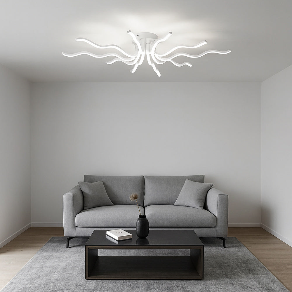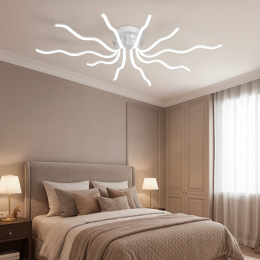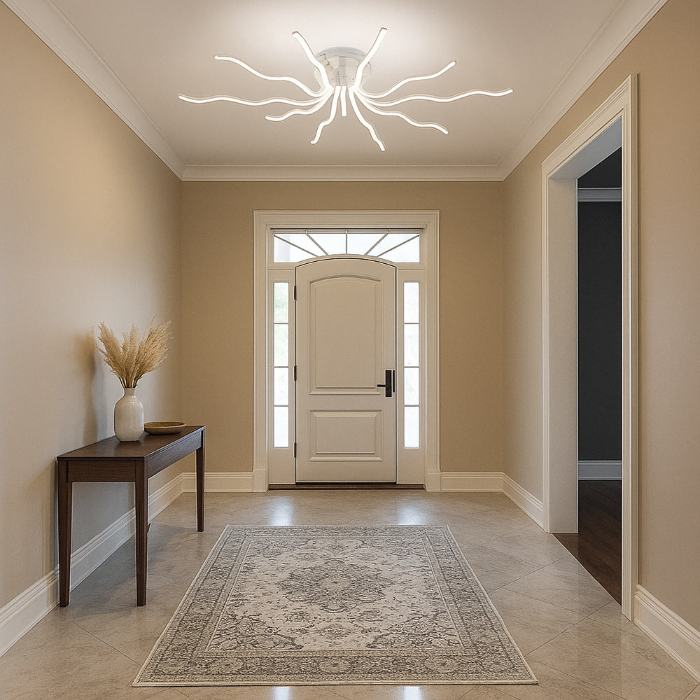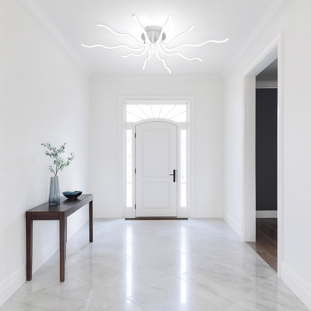 Questo lampadario moderno richiama la forma di un sole stilizzato e si distingue per i suoi 10 raggi luminosi che sprigionano una potenza complessiva di 56 watt. Con un flusso luminoso di 4480 lumen e un ampio angolo di emissione di 180 gradi, garantisce una luce uniforme e avvolgente, ideale per illuminare con eleganza qualsiasi ambiente. La tecnologia CCT integrata consente di scegliere la tonalità di luce preferita tramite lo switch posto sul driver, tra luce fredda 6500K, luce calda 3000K e luce naturale 4000K, e la colorazione può essere modificata in qualsiasi momento per adattarsi alle diverse esigenze e atmosfere. Grazie al suo design scenografico e alla versatilità della regolazione cromatica, questo lampadario è perfetto per il soggiorno, la sala da pranzo, la camera da letto o anche per spazi professionali come uffici e sale riunioni, dove un’illuminazione moderna e personalizzabile diventa un vero valore aggiunto.
