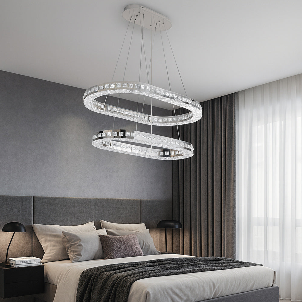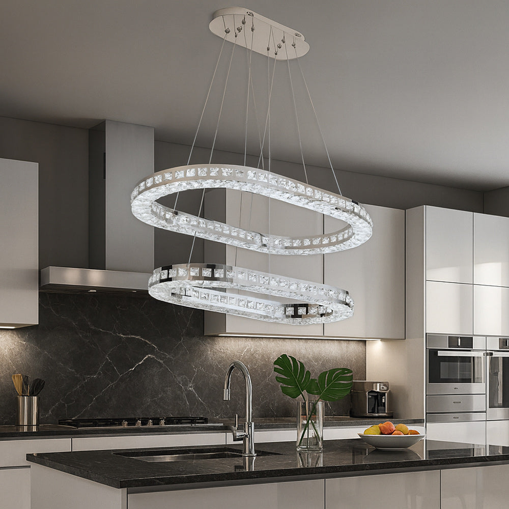 Un lampadario che cattura lo sguardo al primo sguardo e trasforma ogni ambiente in un luogo da vivere. La struttura in metallo cromato riflette la luce con eleganza, mentre i due ovali sospesi, collegati da cavi regolabili, ti permettono di modellare la forma secondo il tuo stile, creando un gioco di volumi che rende unico il tuo spazio. Ogni ovale è impreziosito da cristalli in acrilico trasparenti, rifiniti da una delicata fascia metallica che amplifica i riflessi e dona al soggiorno una luminosità scintillante e raffinata. Con una potenza di 46 watt e un flusso luminoso di 3680 lumen, illumina la stanza con pienezza e armonia, grazie anche all’ampio angolo di apertura di 220°. La tecnologia CCT integrata ti permette di scegliere la temperatura di luce che preferisci: calda per un’atmosfera accogliente, naturale per un equilibrio perfetto, fredda per un tocco moderno e brillante. Un lampadario pensato per chi desidera unire design, personalizzazione e comfort luminoso in un’unica soluzione capace di valorizzare ogni momento della giornata.