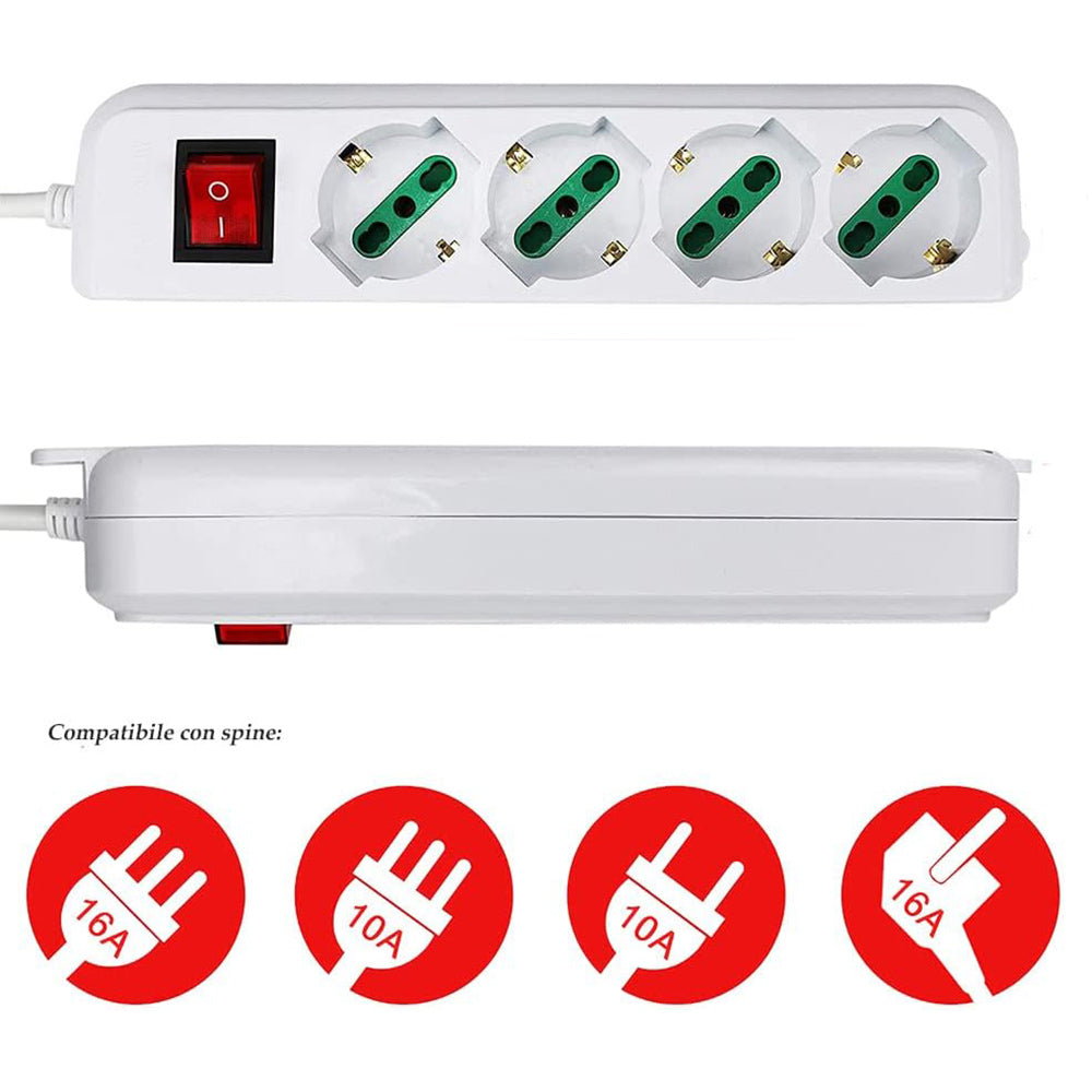 Pratica e sicura, questa multipresa è realizzata in resistente materiale plastico di colore bianco. Dotata di spina italiana 2P+T da 16A, offre 4 prese compatibili Schuko e 10/16A 2P+T, perfette per collegare diversi dispositivi contemporaneamente. Grazie all’interruttore ON/OFF illuminato, posizionato nella parte superiore, puoi gestire facilmente l’alimentazione e ridurre gli sprechi energetici, disattivando con un solo gesto la corrente a tutte le prese collegate. Con un carico massimo di 2500W, questa multipresa è la soluzione ideale per casa e ufficio, garantendo funzionalità, sicurezza e risparmio energetico.