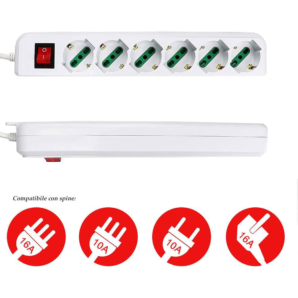 Pratica e sicura, questa multipresa è realizzata in resistente materiale plastico di colore bianco. Dotata di spina italiana 2P+T da 16A, offre 6 prese compatibili Schuko e 10/16A 2P+T, perfette per collegare diversi dispositivi contemporaneamente. Grazie all’interruttore ON/OFF illuminato, posizionato nella parte superiore, puoi gestire facilmente l’alimentazione e ridurre gli sprechi energetici, disattivando con un solo gesto la corrente a tutte le prese collegate. Con un carico massimo di 2500W, questa multipresa è la soluzione ideale per casa e ufficio, garantendo funzionalità, sicurezza e risparmio energetico.