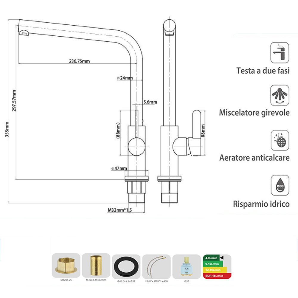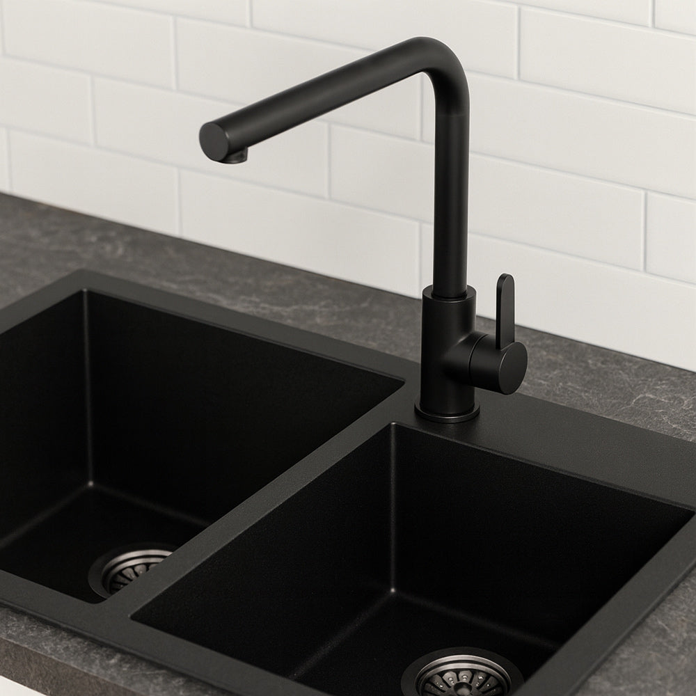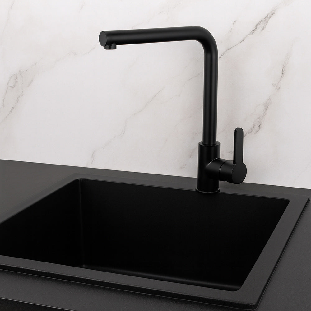 Il rubinetto da cucina in nero unisce linee moderne e funzionalità quotidiana in un design essenziale e raffinato. La bocca alta con angolo a 90 gradi offre un’ampia libertà di movimento e facilita ogni operazione sul lavello, mentre il miscelatore monocomando permette di regolare con precisione flusso e temperatura. La canna è girevole a 360°, offrendo massima flessibilità per lavelli a una o due vasche e rendendo più semplice il risciacquo di pentole, piani e alimenti. La finitura opaca dona un carattere contemporaneo e si integra perfettamente con cucine minimal, industrial o dal gusto più ricercato, garantendo al tempo stesso resistenza a graffi e impronte. Realizzato con materiali di qualità, assicura durata nel tempo e un’esperienza d’uso confortevole, diventando un elemento distintivo che valorizza l’intero ambiente cucina.