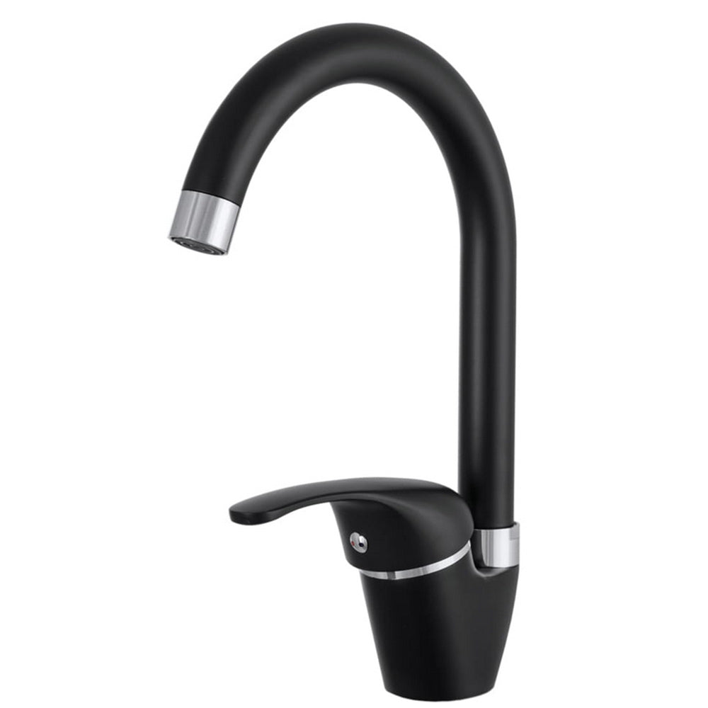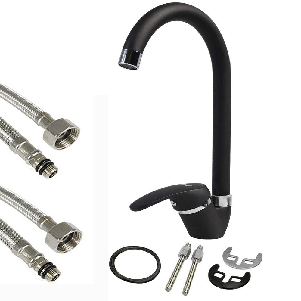 Rubinetto da cucina a canna alta con finitura nero opaco, dal design moderno e minimale che dona eleganza al lavello e si integra perfettamente in ambienti contemporanei. Il beccuccio orientabile garantisce la massima praticità, rendendolo adatto sia a lavelli a una che a due vasche, facilitando il riempimento di pentole voluminose e la pulizia quotidiana. Dotato di leva monocomando per un controllo semplice e preciso del flusso e della temperatura dell'acqua. Viene fornito completo di due flessibili per un'installazione rapida e senza complicazioni. Una scelta ideale per chi cerca funzionalità, stile e affidabilità in cucina.