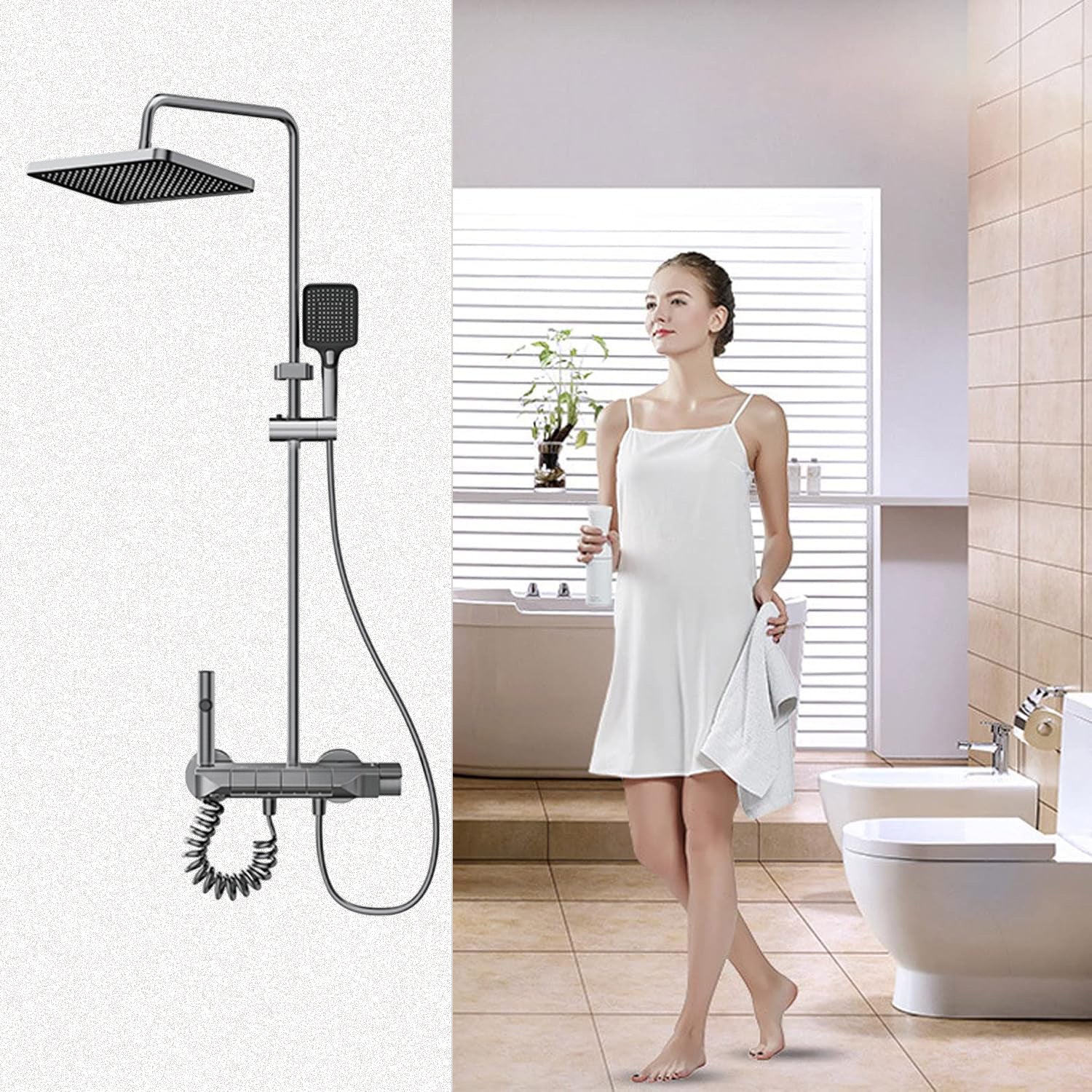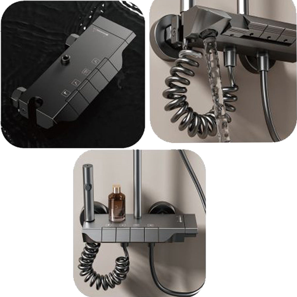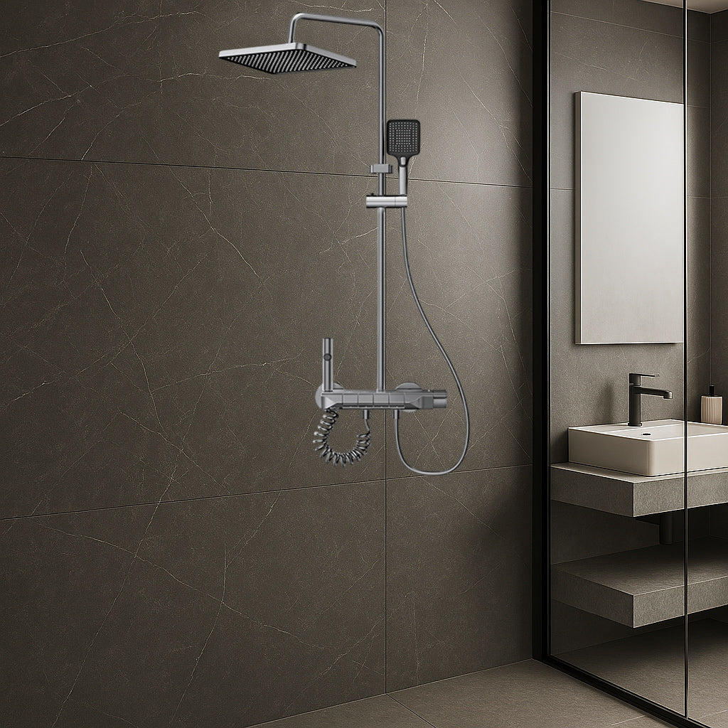 Trasforma la tua esperienza quotidiana in bagno con questo elegante set colonna doccia, pensato per unire comfort, sicurezza e stile. Il sistema include un soffione grande effetto pioggia, una doccetta maneggevole, un rubinetto inferiore e un idroscopino multifunzione, tutti gestibili tramite un miscelatore termostatico a 4 vie. Grazie alla tecnologia termostatica, l’acqua mantiene sempre la temperatura desiderata, evitando spiacevoli sbalzi e scottature. Non serve regolare ogni volta: basta ruotare la manopola per impostare la temperatura ideale. I quattro tasti di selezione permettono di scegliere con precisione quale componente attivare dal soffione principale alla doccetta, dal rubinetto all’idroscopino offrendo massima versatilità. Il design moderno si integra perfettamente in qualsiasi ambiente bagno contemporaneo. Alla base del miscelatore, un ripiano integrato funge da pratico portasapone o supporto per shampoo e prodotti da doccia, mantenendo tutto a portata di mano. Ideale per chi cerca un sistema completo, sicuro e dal look raffinato, questo set colonna doccia è la scelta perfetta per rinnovare il bagno con un tocco di eleganza e funzionalità.