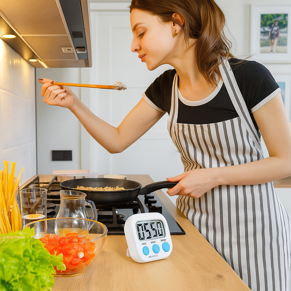 Timer digitale compatto e colorato, perfetto per chi cerca precisione, praticità e un tocco di stile nella gestione del tempo quotidiano. Il suo ampio display consente una lettura chiara e immediata anche a distanza, rendendolo ideale per ogni ambiente: dalla cucina all’ufficio, fino alla palestra. Grazie alla sua versatilità, può essere utilizzato per monitorare cotture, gestire attività lavorative, scandire le pause o accompagnare gli allenamenti, diventando un alleato indispensabile nella routine di tutti i giorni. Dotato di un forte allarme sonoro, è impossibile non sentirlo: il segnale acustico è pensato per attirare l’attenzione anche in ambienti rumorosi, evitando distrazioni o dimenticanze. La funzione di conteggio avanti e indietro (da 00:00 a 99:59) permette di impostare con precisione ogni intervallo di tempo, mentre i quattro tasti grandi e intuitivi (MIN, SEC, START/STOP, RESET) garantiscono un utilizzo semplice e immediato anche per chi non è pratico di dispositivi digitali. La struttura posteriore è progettata per offrire tre modalità di posizionamento: il magnete consente di fissarlo su superfici metalliche come frigoriferi, forni o cappe; il supporto integrato permette di appoggiarlo su qualsiasi piano; l’anello posteriore offre la possibilità di appenderlo, rendendolo adatto anche a spazi verticali o mobili. Alimentato da una batteria AAA (non inclusa), è dotato di un pratico interruttore laterale ON/OFF che consente di spegnerlo quando non è in uso, evitando sprechi di energia. Disponibile in quattro colori vivaci blu, rosa, bianco e verde viene spedito in base alla disponibilità di magazzino, aggiungendo un tocco di allegria e personalità al tuo spazio.