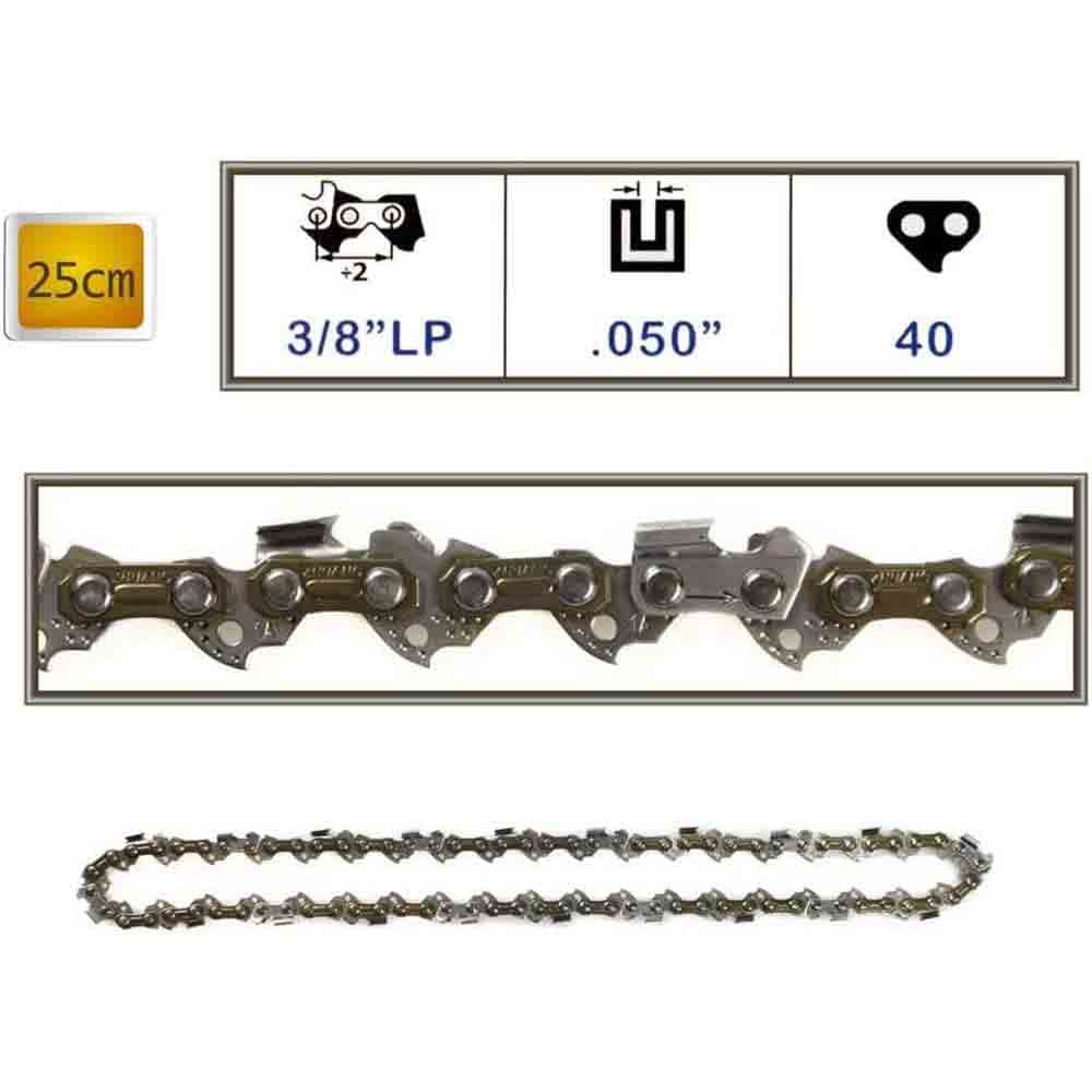 Catena di ricambio per motosega a scoppio 25cc con barre da 25 cm. Passo da 3/8" LP, dispone di 40 maglie, spessore 0.50".