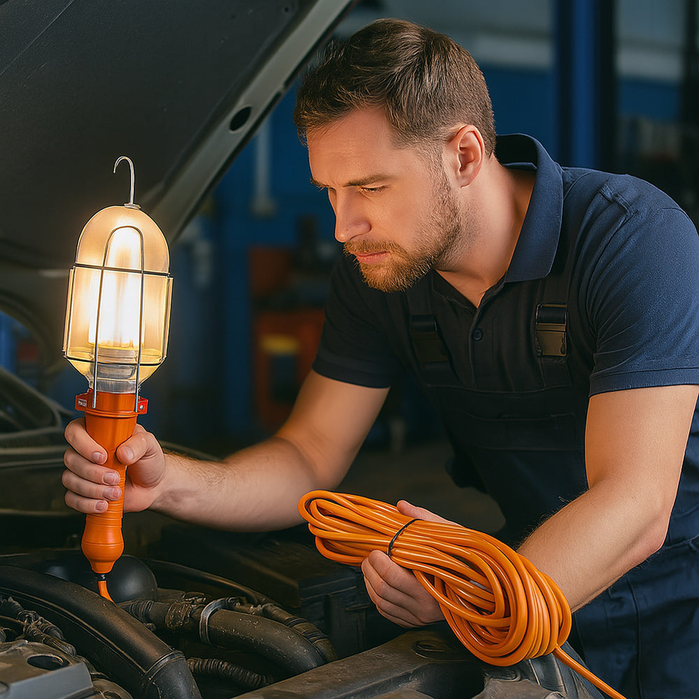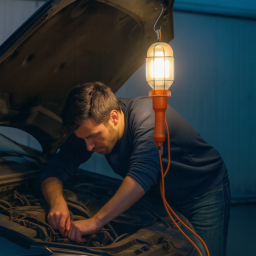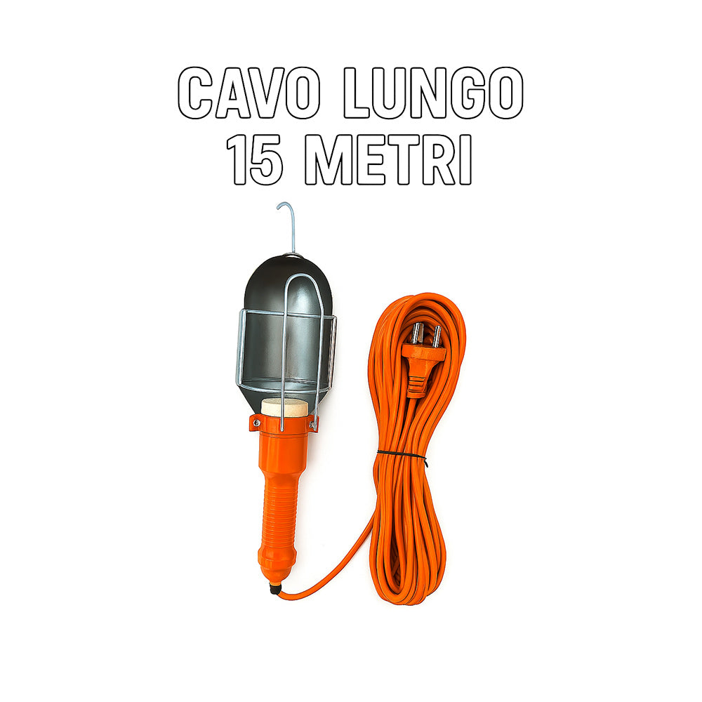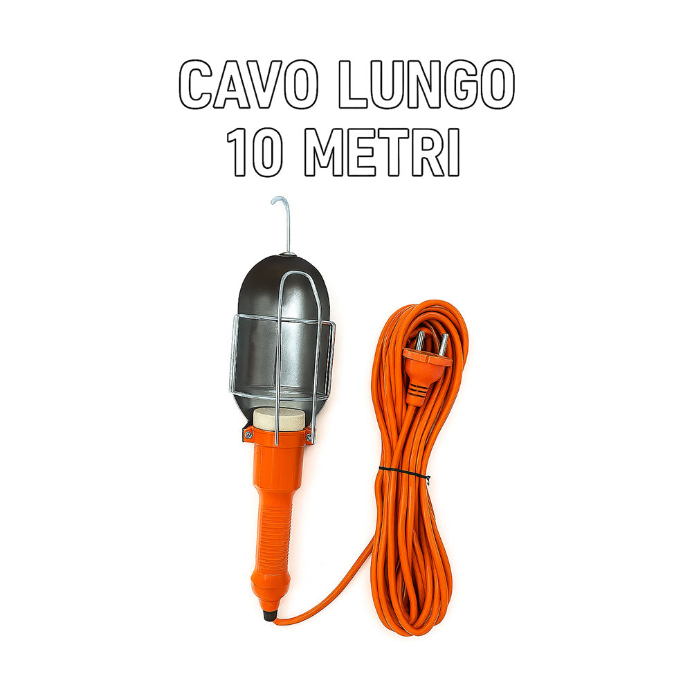 Lampada da officina versatile e pratica, ideale per meccanici, elettrauto, carrozzieri e per chi ama il fai da te. È dotata di interruttore on-off per un utilizzo semplice e immediato, griglia protettiva apribile in alluminio che permette di sostituire facilmente la lampadina, comodo manico in plastica ergonomica e gancio per appenderla così da avere le mani libere durante i lavori. L’attacco E27 (lampadina non inclusa) garantisce compatibilità con le lampadine più comuni. La lampada è disponibile con cavo di tre diverse lunghezze, 5, 10 o 15 metri, completa di spina Schuko per adattarsi a ogni esigenza di lavoro. Una soluzione indispensabile per chi cerca funzionalità, sicurezza e praticità sia in officina che a casa.