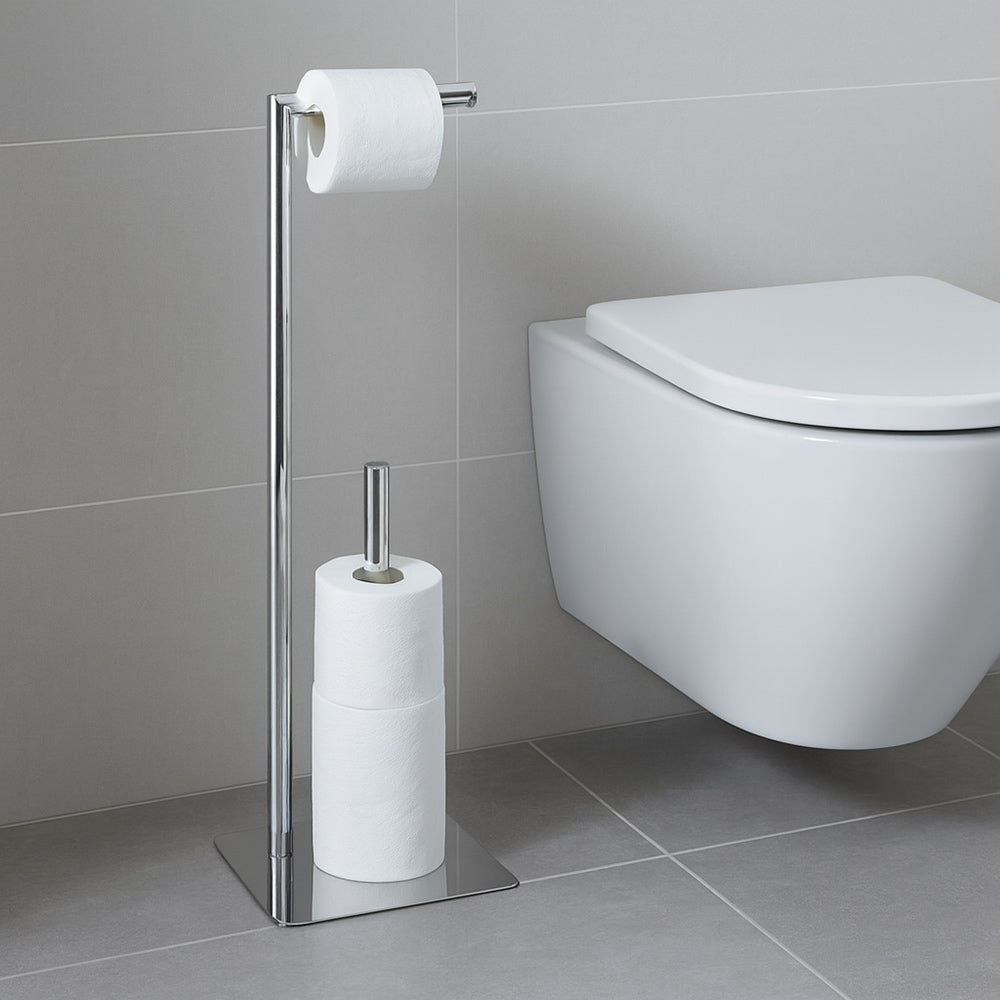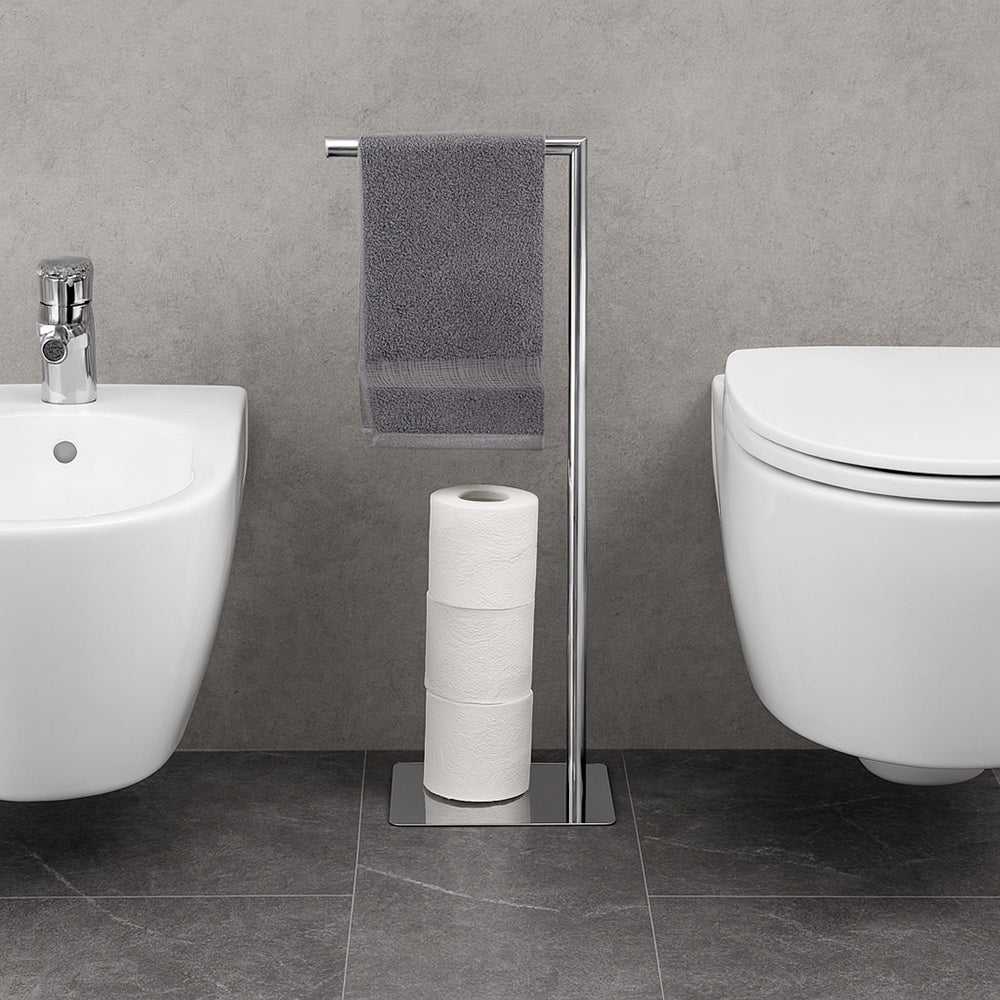 Aggiungi un tocco di stile e funzionalità al tuo bagno con questa piantana porta rotolo in metallo, un accessorio che unisce solidità, praticità ed eleganza in un unico elemento. La struttura robusta e il design moderno la rendono perfetta per chi cerca un dettaglio raffinato capace di valorizzare l’ambiente senza rinunciare alla comodità. È dotata di un braccio orizzontale superiore pensato per il rotolo di carta igienica e di un supporto verticale che consente di riporre più rotoli di scorta, mantenendo sempre tutto in ordine e a portata di mano. La sua versatilità permette di adattarla anche come porta asciugamani da bidet: basta appoggiare l’asciugamano sul braccio orizzontale e utilizzare il supporto verticale per il rotolo di carta. Le linee essenziali e la finitura lucida si integrano armoniosamente con qualsiasi stile di arredamento, dal minimal più sobrio alle soluzioni più sofisticate, conferendo sempre un tocco di classe. Essendo una soluzione freestanding, non richiede alcuna installazione a parete e può essere spostata facilmente in base alle esigenze, offrendo massima libertà di utilizzo e adattandosi perfettamente a spazi di ogni dimensione.